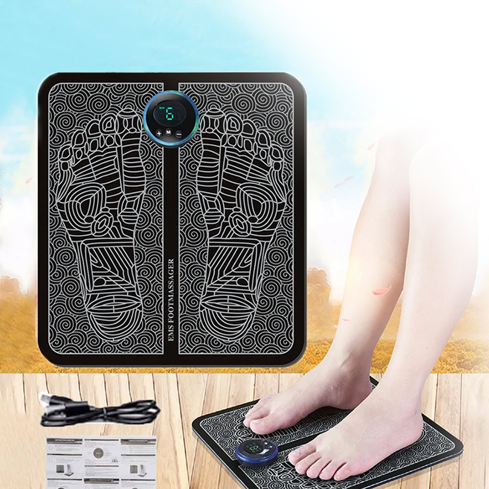 • ابدأ راحة جسدك من القدمين مع جهاز مساج القدم. Start resting your body from the feet with a foot massager. • """*المميزات* • بها 6 أوضاع مختلفة ( مساج - كشط - الضغط -الوخز بالإبر - الحجامة - العجن). • 10 مستويات مختلفة من التدليك لاختيار المناسبة. • شاشة LCD كبيرة، تساعد علي ضبط مستوي السرعة و الوضع و الوقت. • تحسن الدورة الدموية عن طريق تقلص عضلات القدمين والساقين. • يساعد في علاج أعصاب القدم والتشنجات والتهاب اللفافة الأخمصية وتورم القدمين. • تعمل عن طريق الشحن أو من خلال بطارية • مناسب للمسافرين ، وكبار السن، والنساء اللواتي يرتدين الكعب العالي غالبًا. • مرة سهلة التخزين، قابلة للتسفيط يسهل أخذها معك في اي مكان. • الوصف • الابعاد:- 12.6*11.4 أنش. • الخامة:- جلد. • البطارية: 2 × بطاريات AAA (غير مدرجة). • بطارية نمط قابلة لإعادة الشحن: 1 × 750 مللي أمبير بطارية مدمجة. • ملحقات العبوة • 1 × وسادة تدليك القدم المريحة EMS. • كيفية الإستخدام • اضغط على زر """"+"""" أو """"-"""" لضبط الكثافة وتشغيل / إيقاف التشغيل، للتبديل بين الاوضاع الستة، اضغط على زر """"M"""" • ""*Product features* • Premium conductive, non-slip material topped with soft, conductive carbon vegan leather. • Relieves stress and improves blood circulation. • Relieves lower back pain, migraine, and foot pain such as arthritis. • You can easily relax and massage your feet anytime and anywhere. • Convenient, portable and foldable. • More details • Dimensions: 35.79 x 6.51 x 2.69 inches. • Weight: 191 grams. • Made of durable and soft rubber backing."